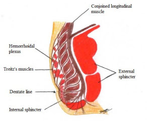 Anal cushions are held in their normal position by the Tretiz’s muscle, as seen in the Fig 2.