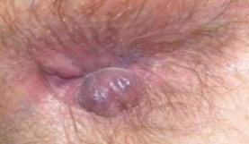 a) External Piles – External haemorrhoids are a perianal swelling that develops as a result of thrombosis from the inferior haemorrhoidal plexus. This normally occurs because of sudden trauma after passing hard stools or straining. They are present at the anal margins and are covered by skin. They are usually painful and seen as a small tender lump outside the anal