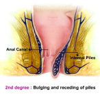 Grade 2 – Also called as Second Degree Piles. Piles protrudes during the passage of stool but recede back on its own. Bleeding, itching, and discomfort are common symptoms at this stage.