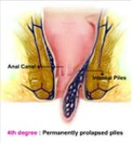 Grade 4 – Also known as Fourth Degree Piles. Piles may protrude any time of the day and remains permanently protruded. They need treatment or surgery (called a haemorrhoidectomy). They may lead to considerable pain, bleeding, itching, and difficulty in hygiene maintenance.